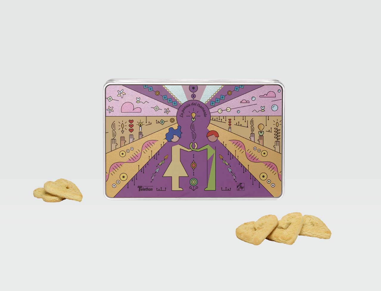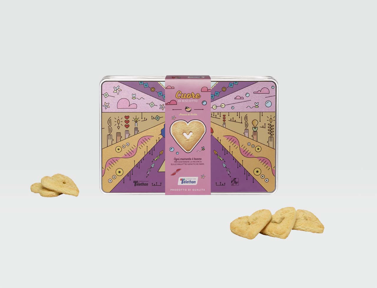 Fai una scelta speciale: i Cuori di biscotto con arance di Sicilia, dove il gusto delicato della frolla si mescola con la freschezza delle arance di Sicilia. Ideali per accompagnare il caffè a colazione o un tè a merenda o come dolce prelibatezza durante la giornata, i biscotti a forma di cuore sono frutto della collaborazione tra Grondona, storia pasticceria genovese, e Fondazione Telethon. Grazie all’elegante scatola in latta, riutilizzabile, con un’illustrazione originale, i Cuori di biscotto sono un’idea regalo originale: scegliendoli sostieni la ricerca e aiuti tutte le mamme che ogni giorno sono al fianco dei loro bambini con una malattia genetica rara.