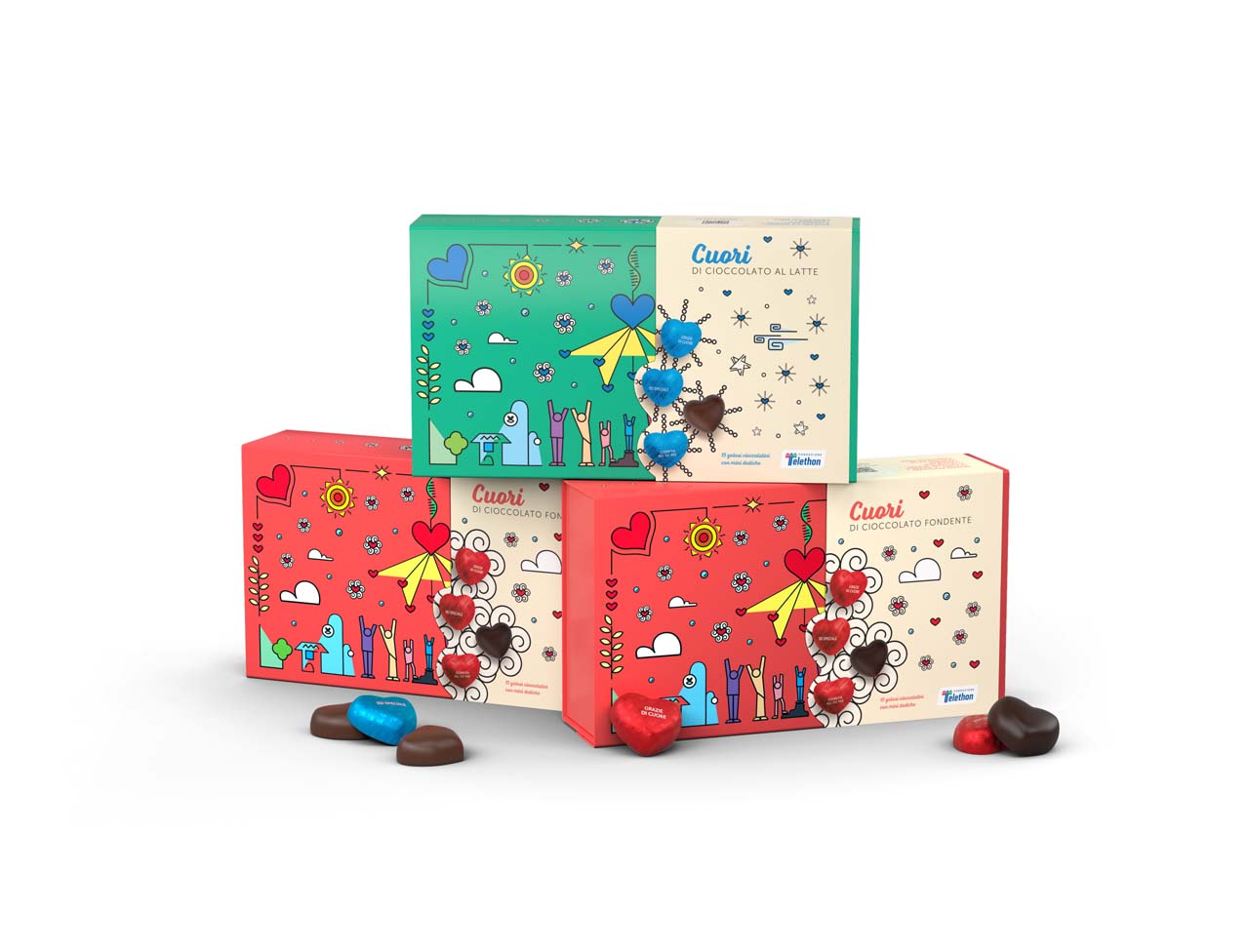 I Cuori di cioccolato si presentano con un’elegante confezione, conservabile, collezionabile e riutilizzabile, dall’illustrazione esclusiva e nei due gusti classici e squisiti: due al gusto fondente e una al cioccolato al latte, confezionate separatamente. Perché scegliere quando puoi averli tutti? Scopri le dolci dediche che accompagnano i 15 grandi cioccolatini presenti in ogni scatola e fai il dono perfetto ad amici e parenti. Con il tuo regalo sostieni la ricerca sulle malattie genetiche rare.