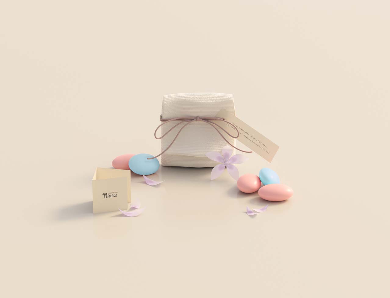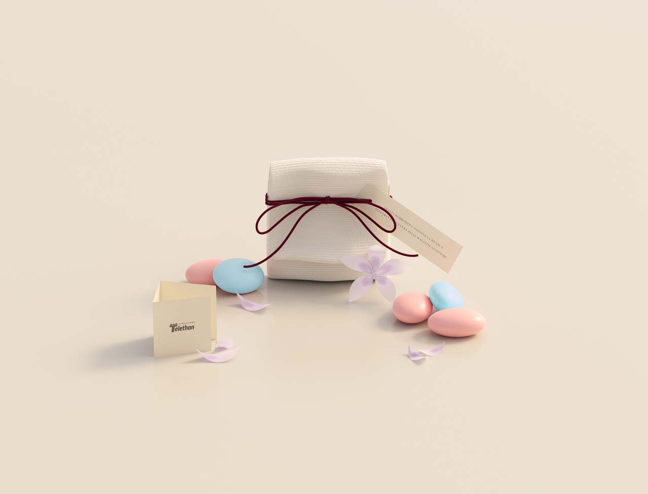 Corredata da una fascetta su cui è riportato il seguente testo: “Questa bomboniera sostiene la ricerca Telethon per la cura delle malattie genetiche”
